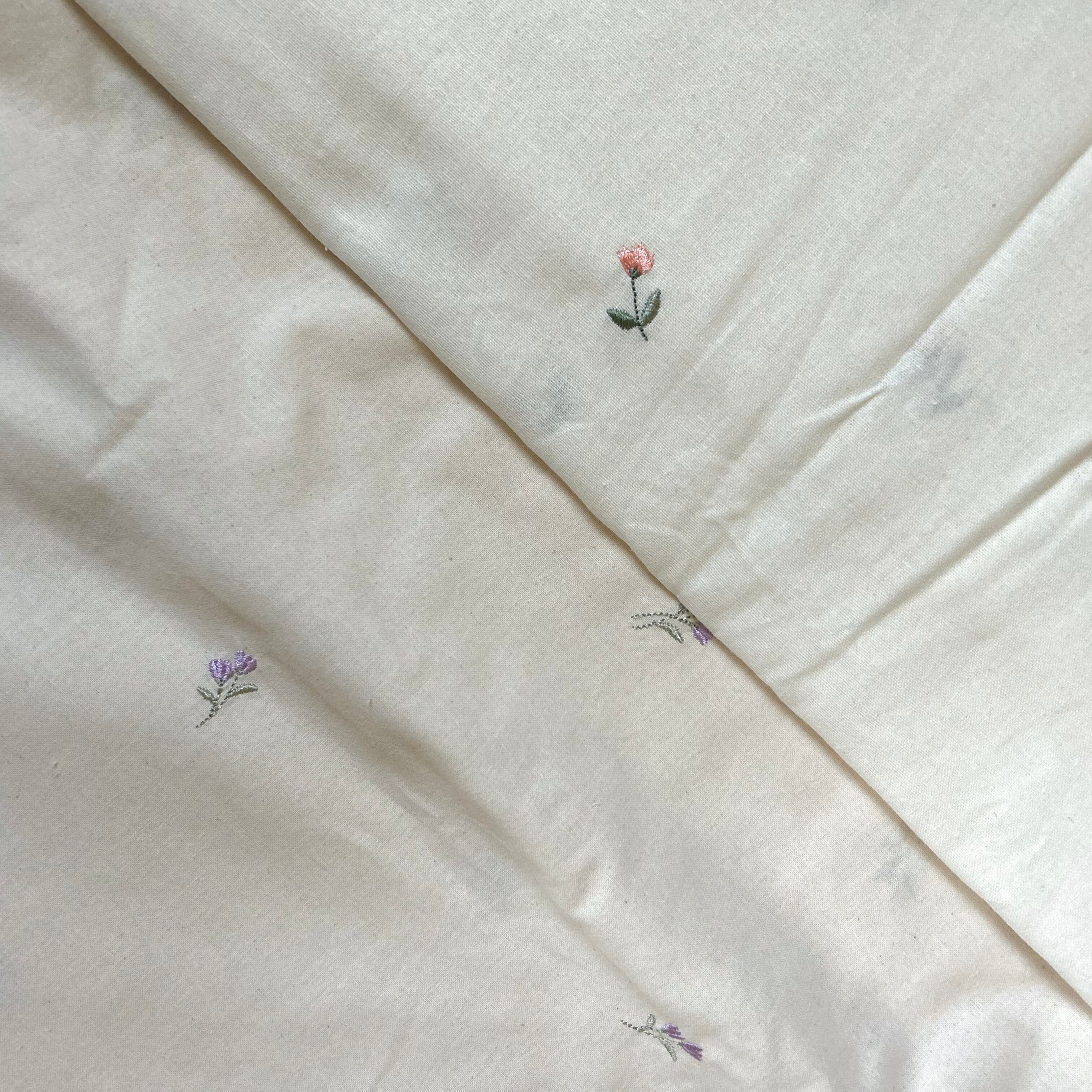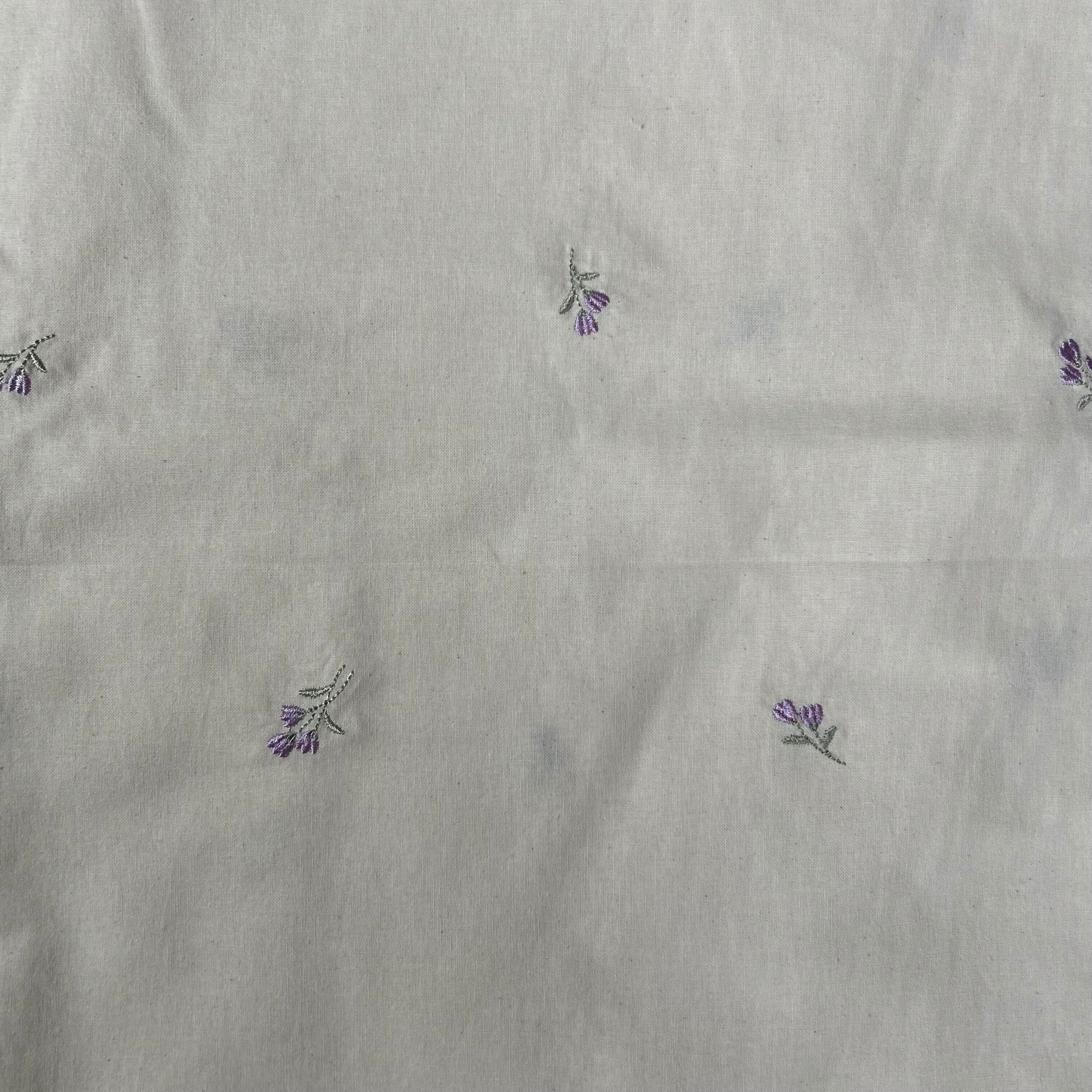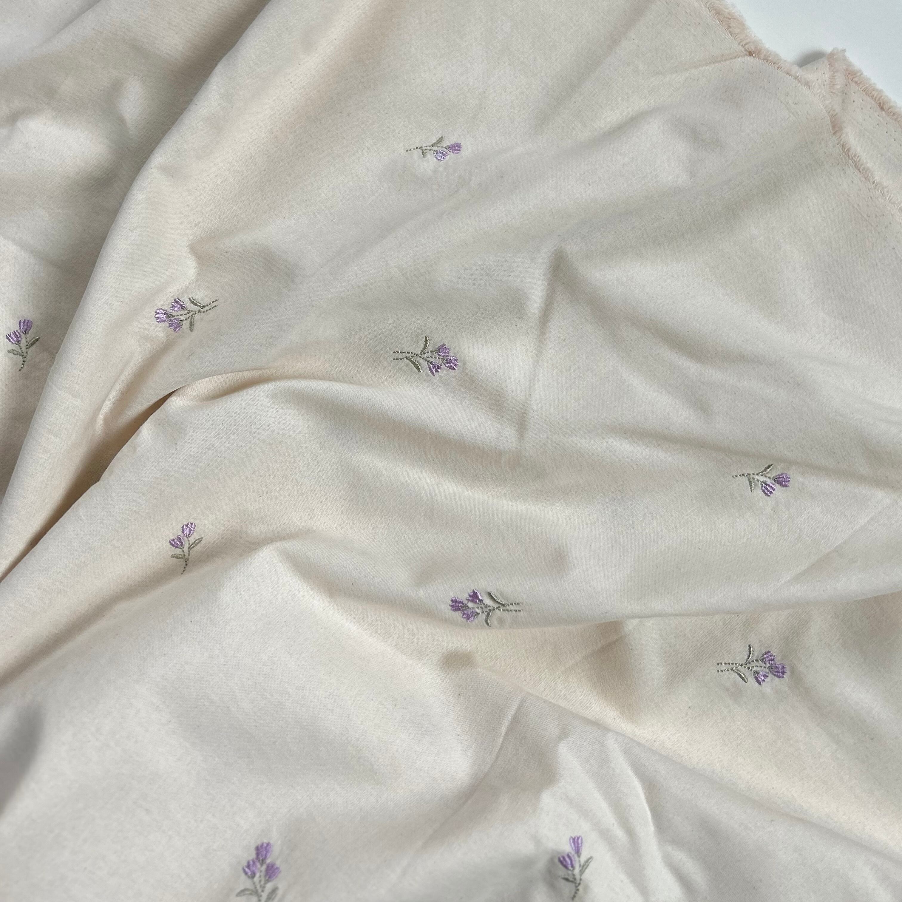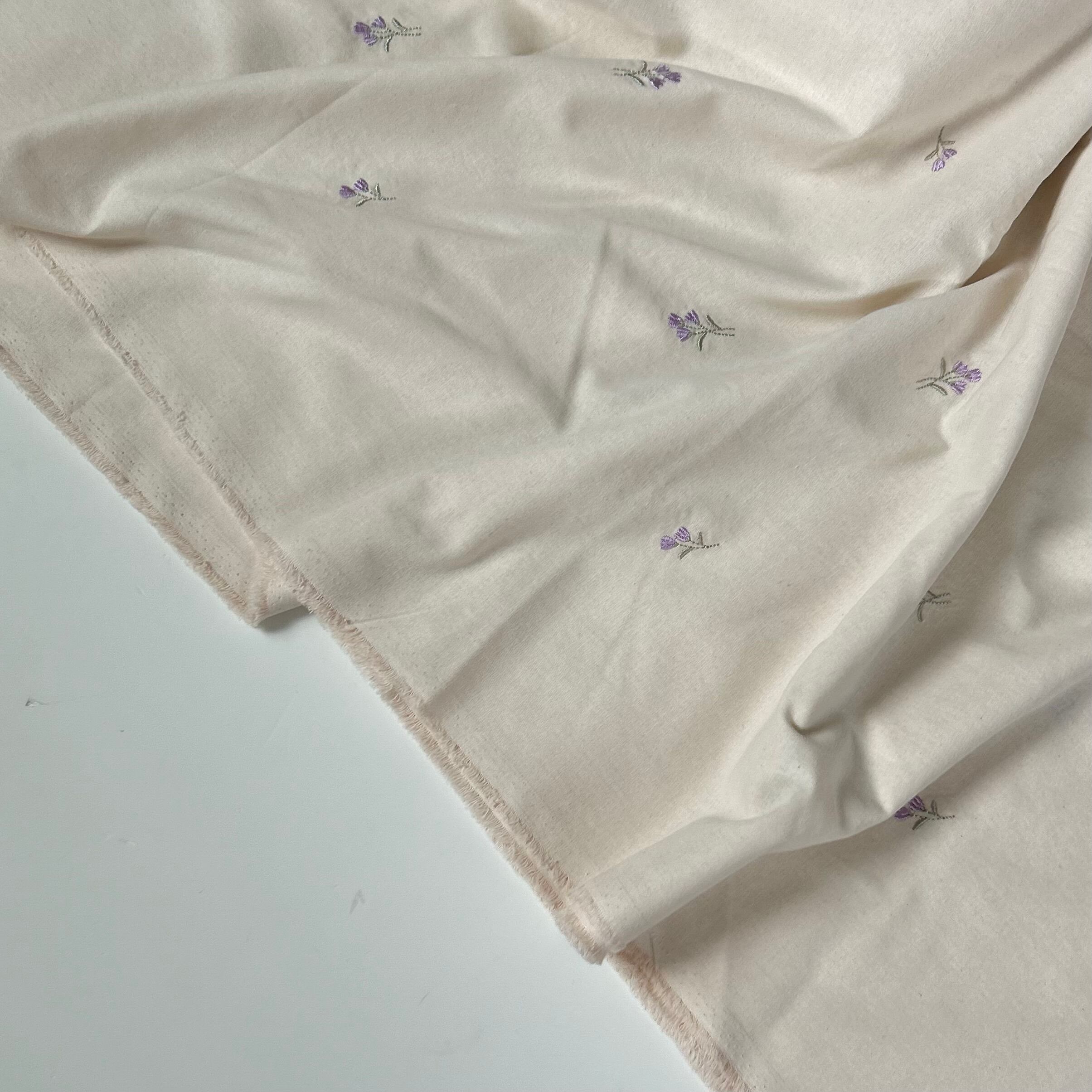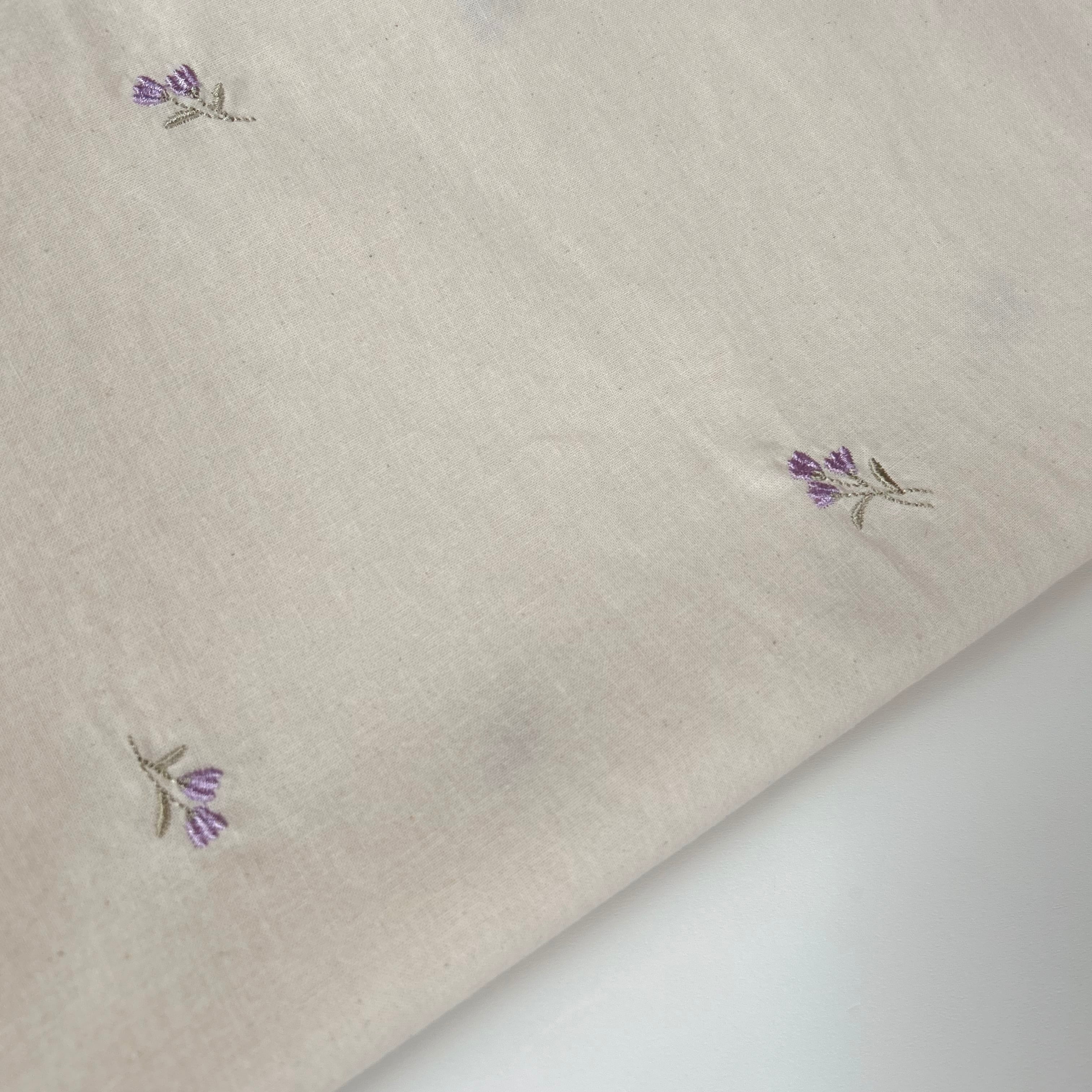 ウォッシング加工が施されたコットン生地に、ライラックの刺繍が入った可愛い生地♡